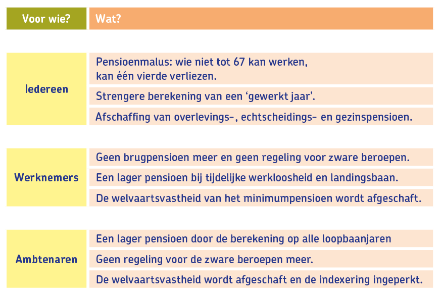 De pensioenen van de werknemers in de privé worden ook door drie maatregelen geraakt. Ten eerste is er de afschaffing van het brugpensioen (SWT) waar vooral de zware beroepen van gebruikmaakten. Die bestaan volgens de Arizona-partijen niet meer. ‘Er zijn geen zware beroepen, alleen zwakke lichamen.’ Ten tweede: er komt een maximum aan gelijkgestelde periodes en wie in een landingsbaan stapt of tijdelijk werkloos is, ziet zijn pensioen voortaan berekend op een beperkt minimumloon. Ten derde, de welvaartsvastheid van het minimumpensioen wordt afgeschaft. Daardoor gaat de verhoging van het minimumpensioen tijdens de afgelopen jaren grotendeels weer verloren.