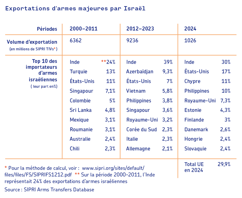 Aujourd’hui, la problématique des exportations d’armes européennes vers Israël est une question cruciale. Rendre ces exportations illégales toucherait l’effort de guerre israélien. Même si elles sont généralement compliquées à cibler, du fait du manque de données, on sait, toujours d’après le SIPRI, que l’Allemagne représentait, sur la période 2000-2023, 20% des exportations d’armes majeures vers Israël, et l’Italie environ 2,3%.