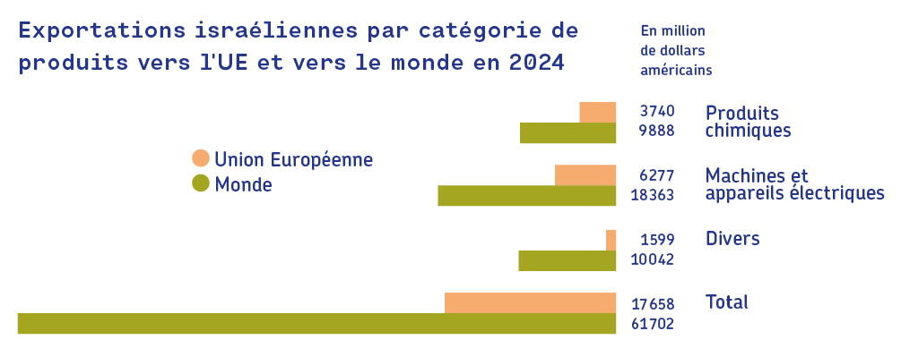 - Imports and Exports of Goods and Services, Statistical Abstract of Israel 2024 n° 75, cbs.gov.il (selon les estimations faites à partir de la répartition par pays de 2018).