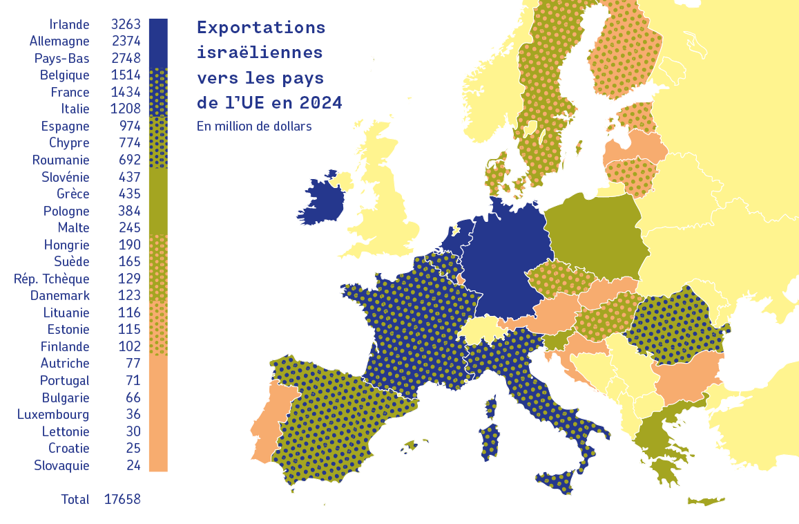 L’étude du commerce extérieur nous apprend aussi à ne pas nous fier aux beaux discours politiques. Par exemple, l’Irlande a certes reconnu la Palestine et l’existence d’un génocide à Gaza24, mais elle n’en demeure pas moins le premier importateur de biens israéliens de l’UE, et le deuxième au monde après les États-Unis en 2024, pour une population treize fois moindre que la France. Son adhésion à l’UE, et donc son absence d’autonomie en matière de politique commerciale, peut en partie expliquer ce manque de mesures concrètes au-delà des déclarations politiques.